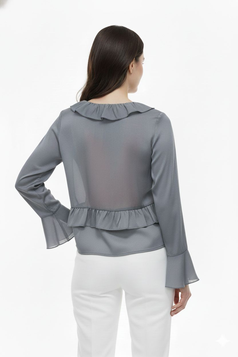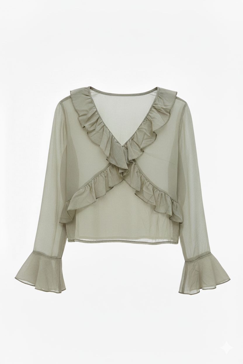 Prenda de estilo bolero con cuello en V profundo y volantes que se cruzan en el frente, ofreciendo un diseño etéreo. Las mangas largas terminan en puños acampanados y con vuelo, aportando un toque romántico y ligero. Su tejido es semitransparente.