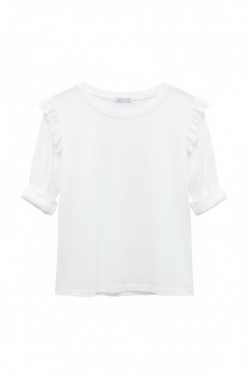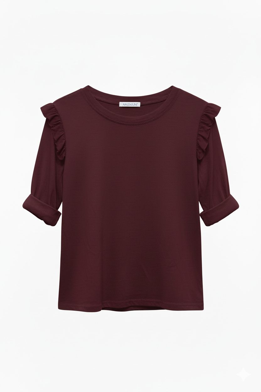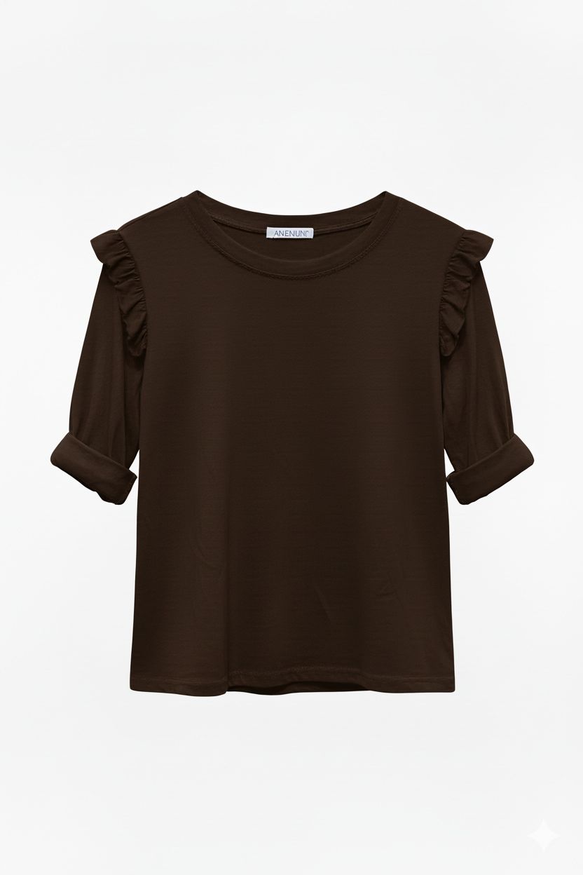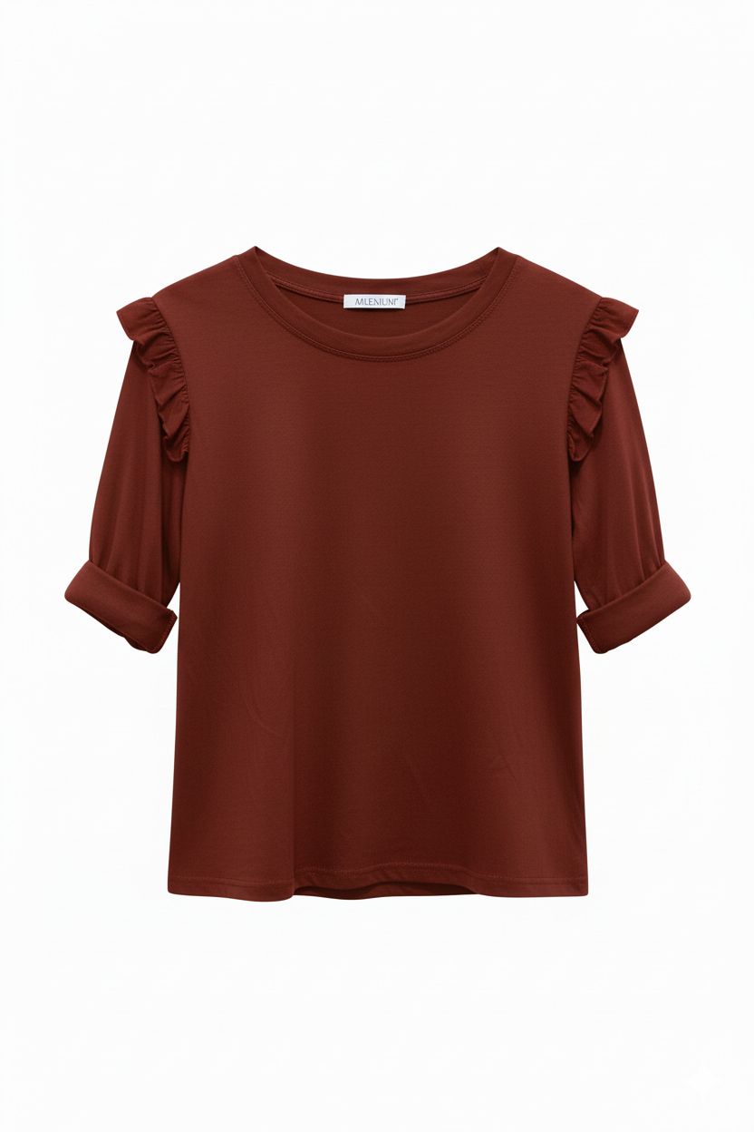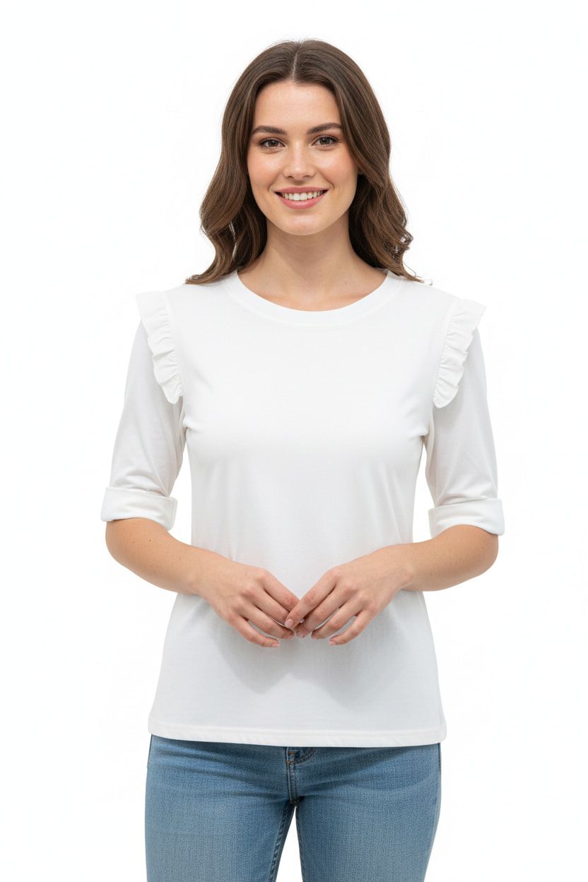 Esta blusa de corte clásico presenta un diseño elegante y versátil, ideal para cualquier ocasión. Con mangas tres cuartos que terminan en un puño vuelto y delicados volantes en los hombros, añade un toque sofisticado. Su silueta relajada ofrece comodidad sin sacrificar el estilo, haciendo de ella una prenda esencial para un look casual o más formal.