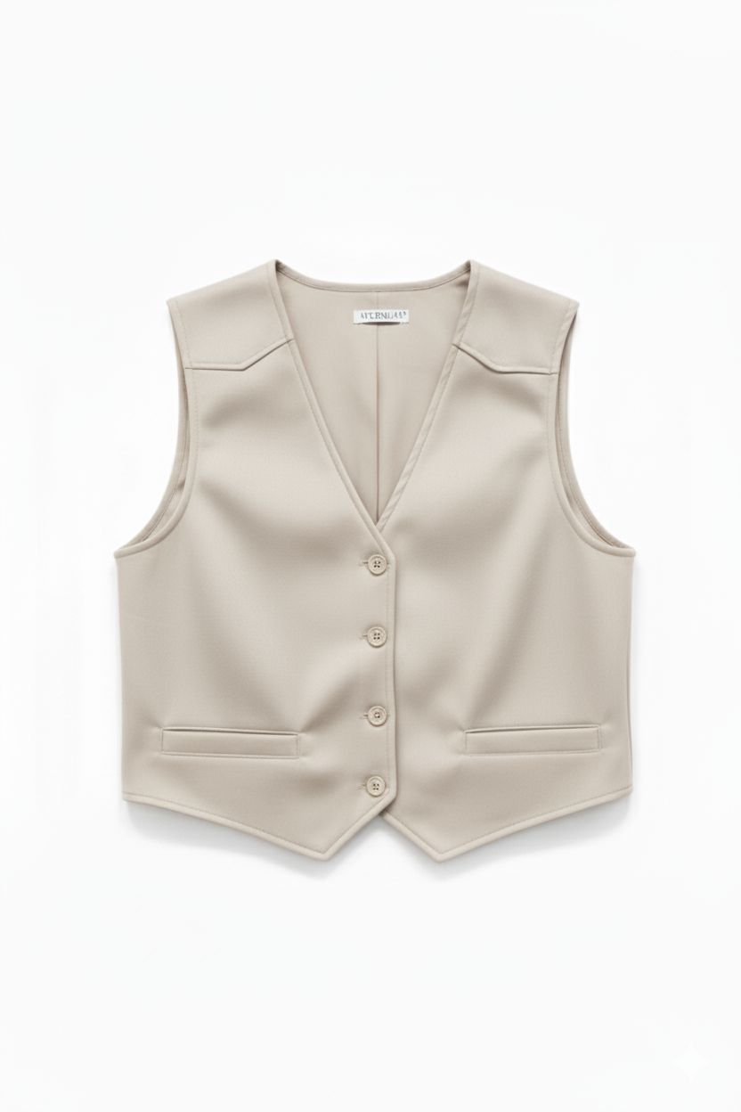 Este chaleco de diseño clásico y corte sastre presenta un elegante cuello en V y un frente abotonado. La prenda incluye dos pequeños bolsillos ribeteados a la altura de la cintura. Su tejido liso y la costura de pinzas aseguran un ajuste estructurado y sofisticado, ideal para complementar cualquier atuendo formal o de negocios.