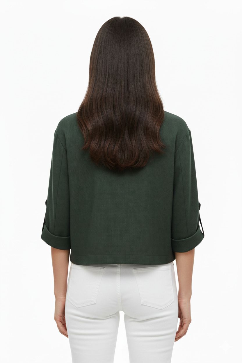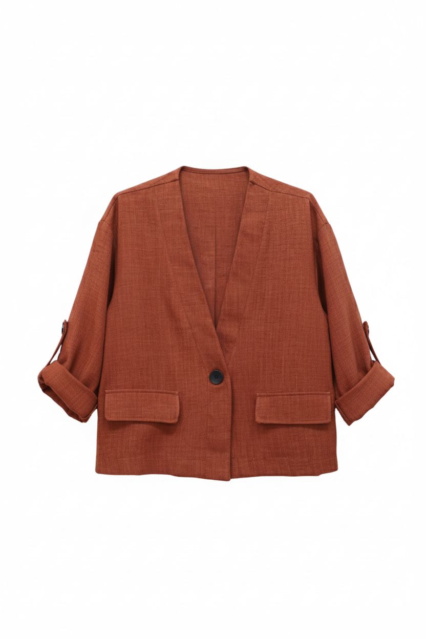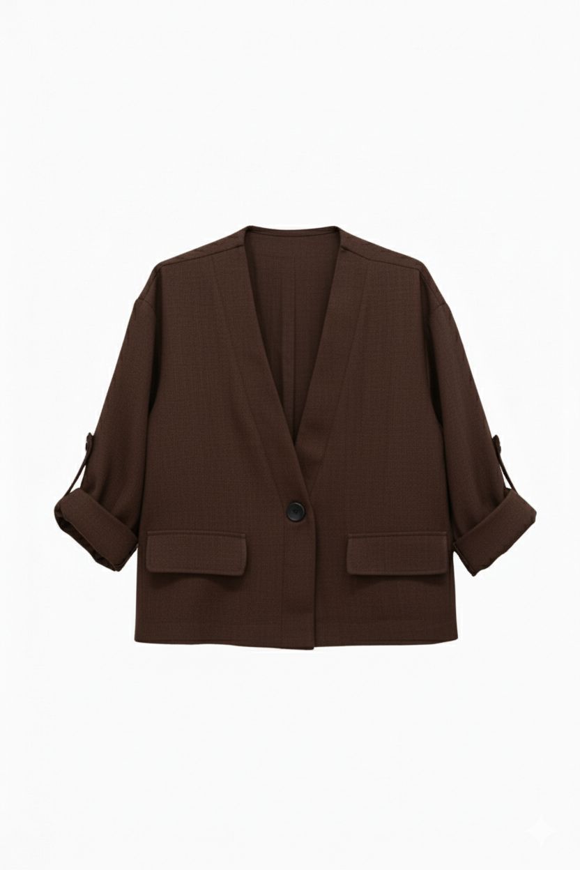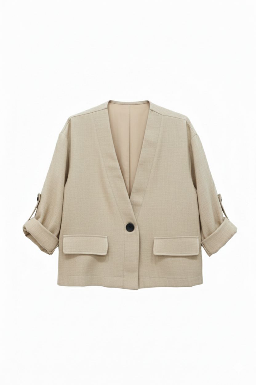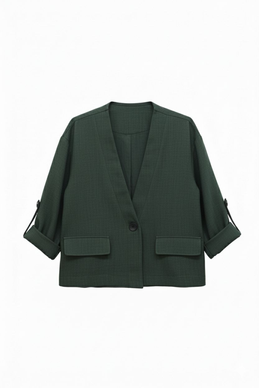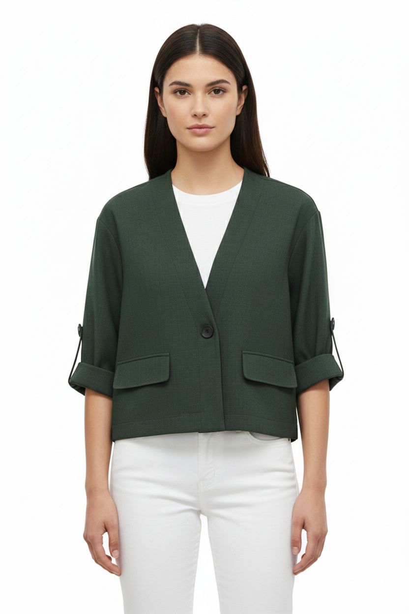 Chaqueta de diseño contemporáneo y corte cropped, ideal para un look versátil. Presenta un elegante cuello en V sin solapa y un cierre con un solo botón frontal. Destacan sus mangas tres cuartos, terminadas en puños doblados ajustables con detalle de tirilla y botón, aportando un toque casual y sofisticado. Incluye dos prácticos bolsillos de parche en la parte inferior, manteniendo la línea limpia y la funcionalidad de la prenda.
