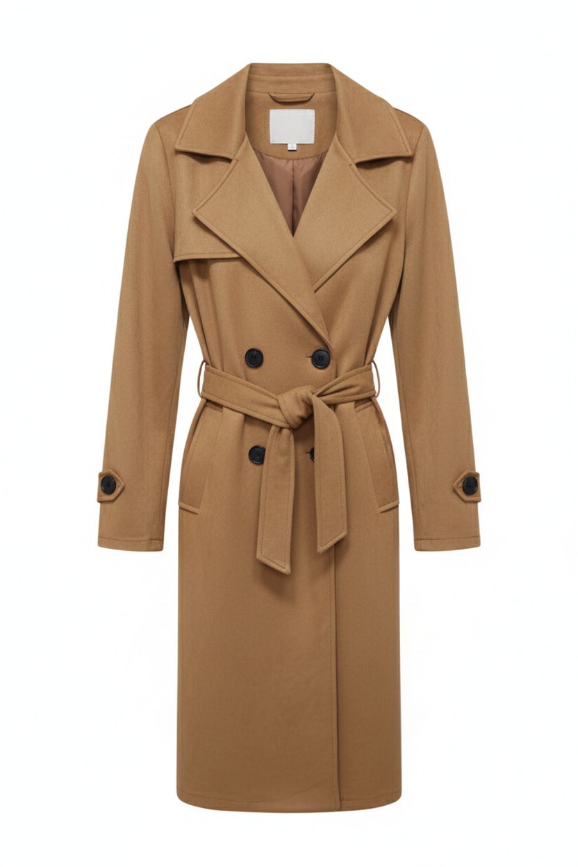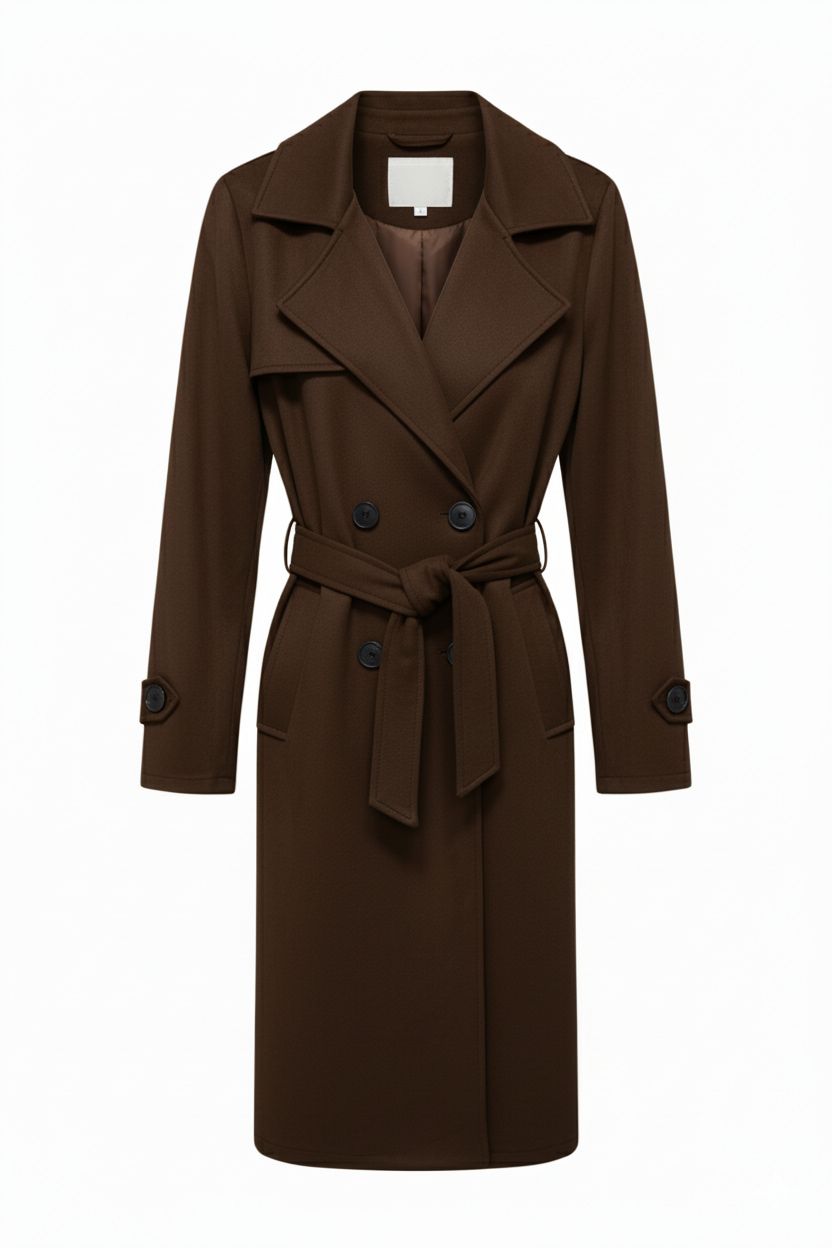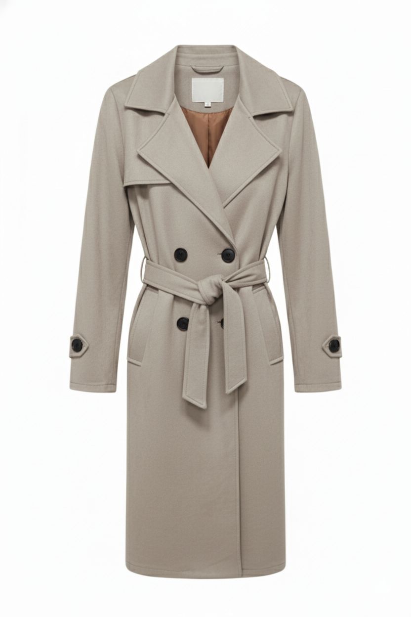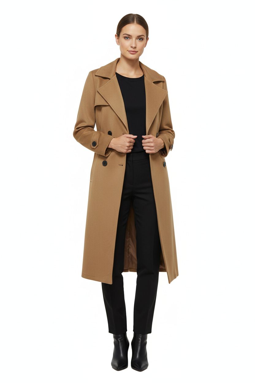Diseño de corte clásico y largo, con solapas amplias y cierre de doble botonadura. Incluye un cinturón ajustable a la cintura para una silueta definida, y detalles de trabillas en las mangas. Es una prenda exterior ideal para el clima de transición.