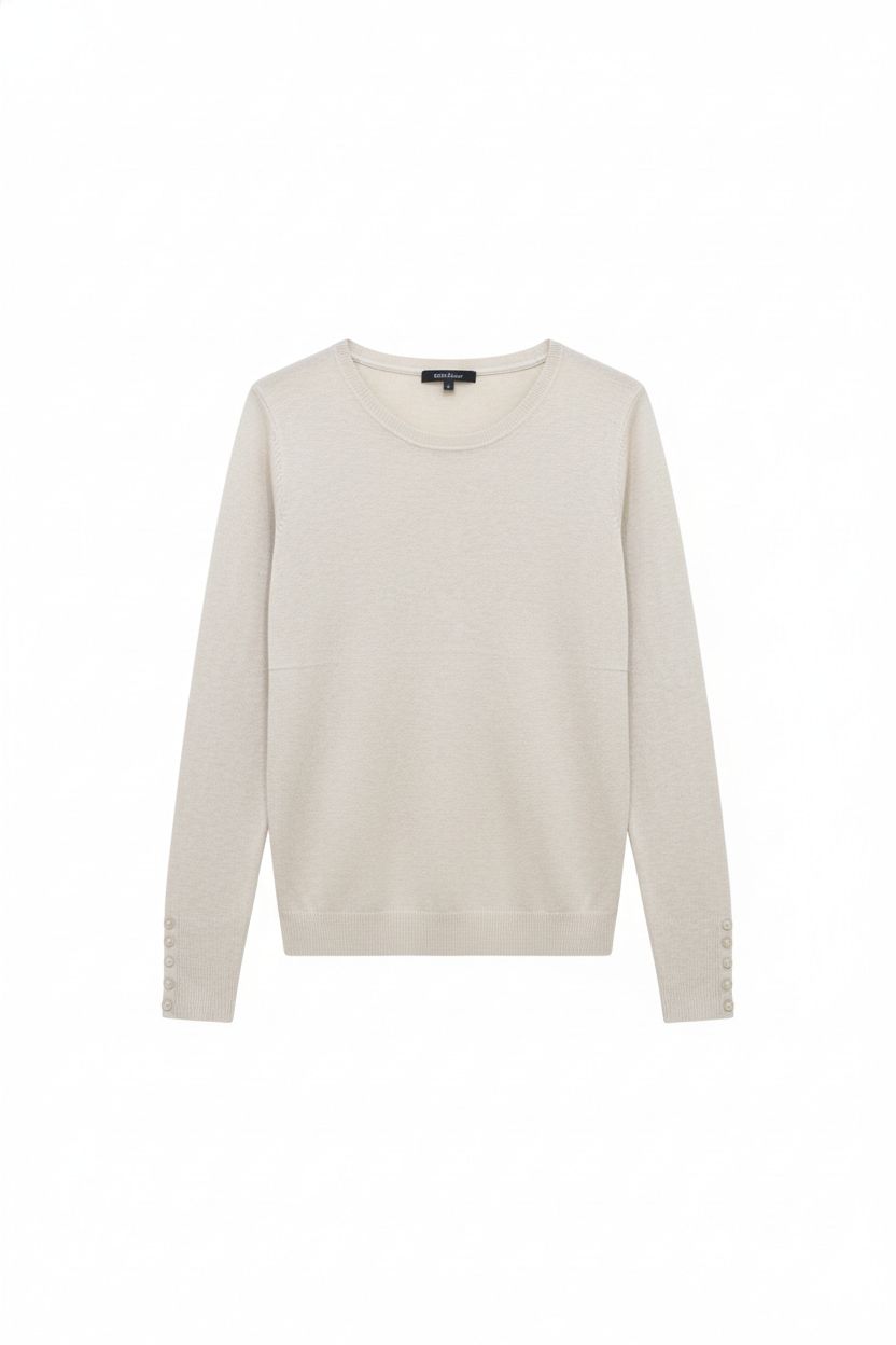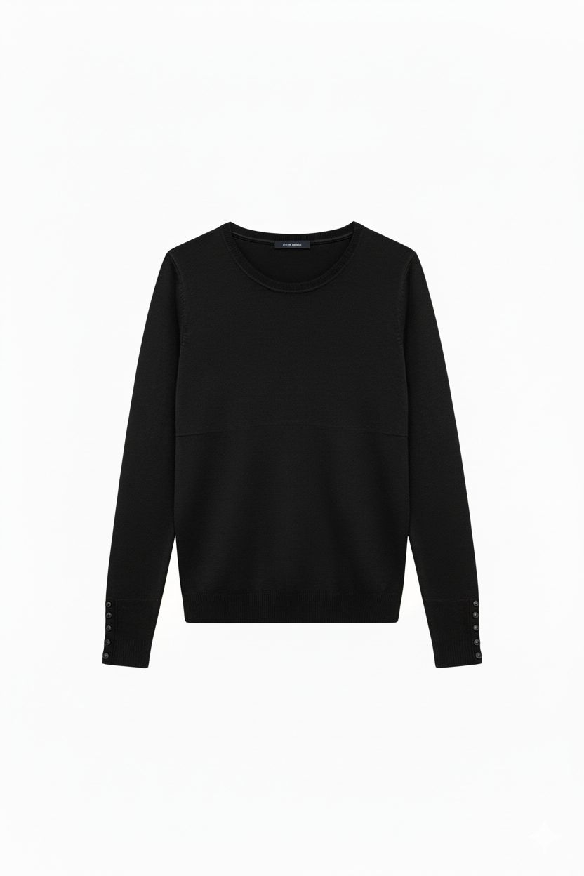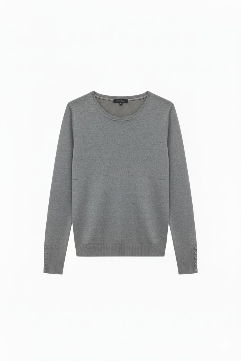 Jersey de manga larga con cuello redondo, diseño de punto sutil y detalles de botones decorativos en los puños, aportando un toque clásico y elegante. Esta prenda versátil es ideal para cualquier ocasión, ofreciendo confort y un estilo sofisticado.