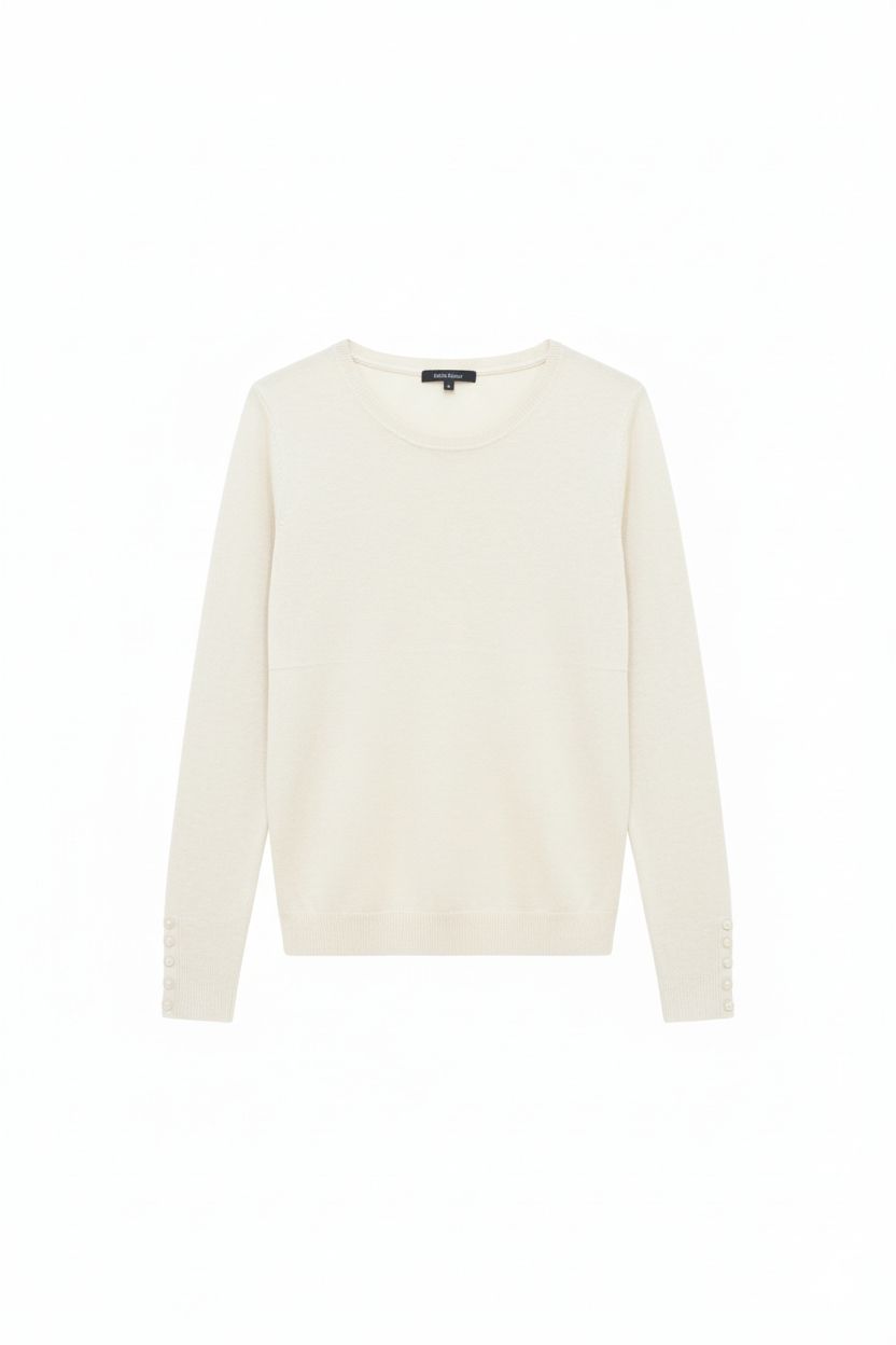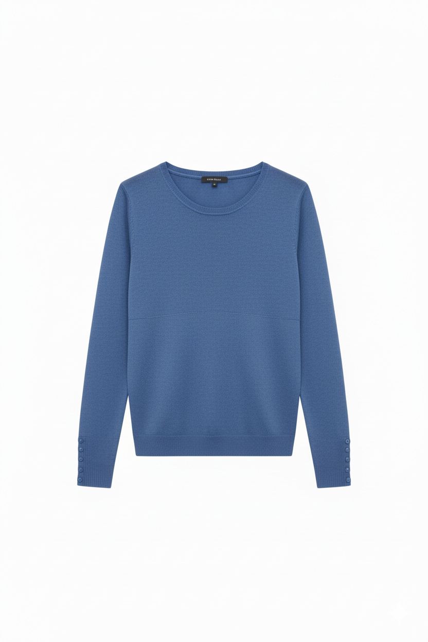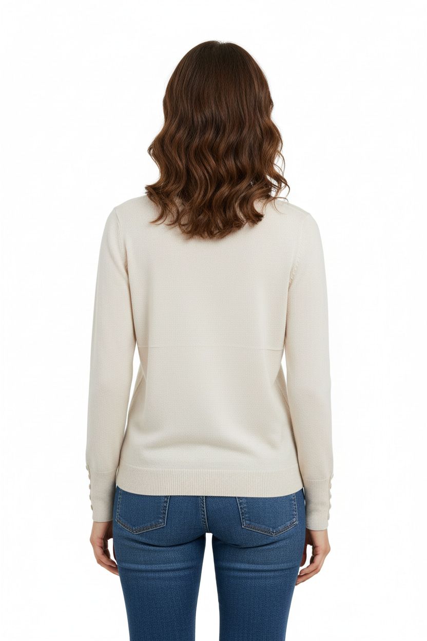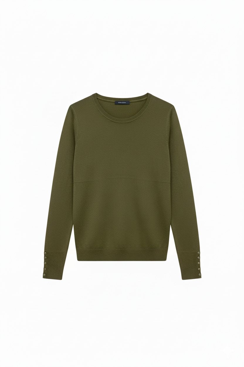 Jersey de manga larga con cuello redondo, diseño de punto sutil y detalles de botones decorativos en los puños, aportando un toque clásico y elegante. Esta prenda versátil es ideal para cualquier ocasión, ofreciendo confort y un estilo sofisticado.
